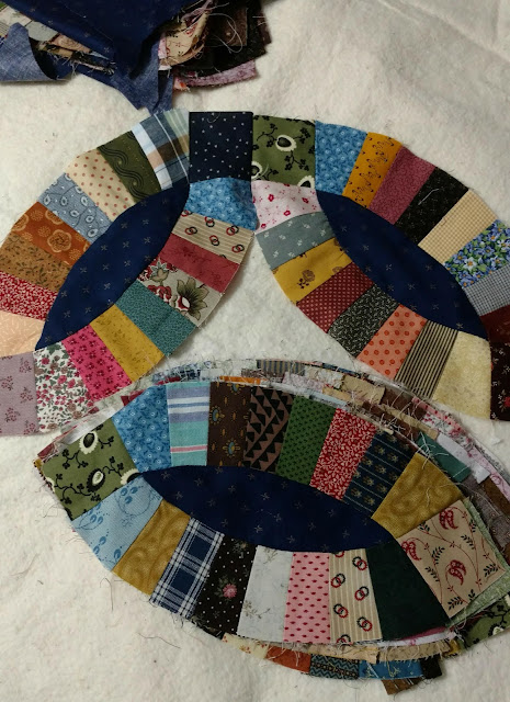 Last week I went as far as I could with my quilt without cutting more center pieces and melons, and decided to do a count. I am doing this double wedding ring quilt along with Jo of Jo's Country junction.