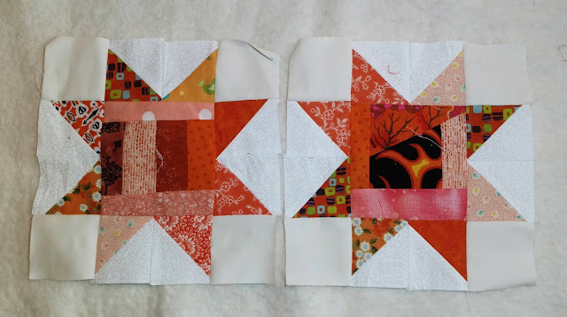 Most of my orange scraps are gone, but, I have strings and crumbs which I needed for crumb stars and the rainbow scrap challenge at so scrappy this month. I am using 4 1/2 inch squares of crumbs for the center and 2 1/2 inch HSTS for the star points. With the year almost over ( how did that happen), I will be figuring out what to do with the stars I have made this year.