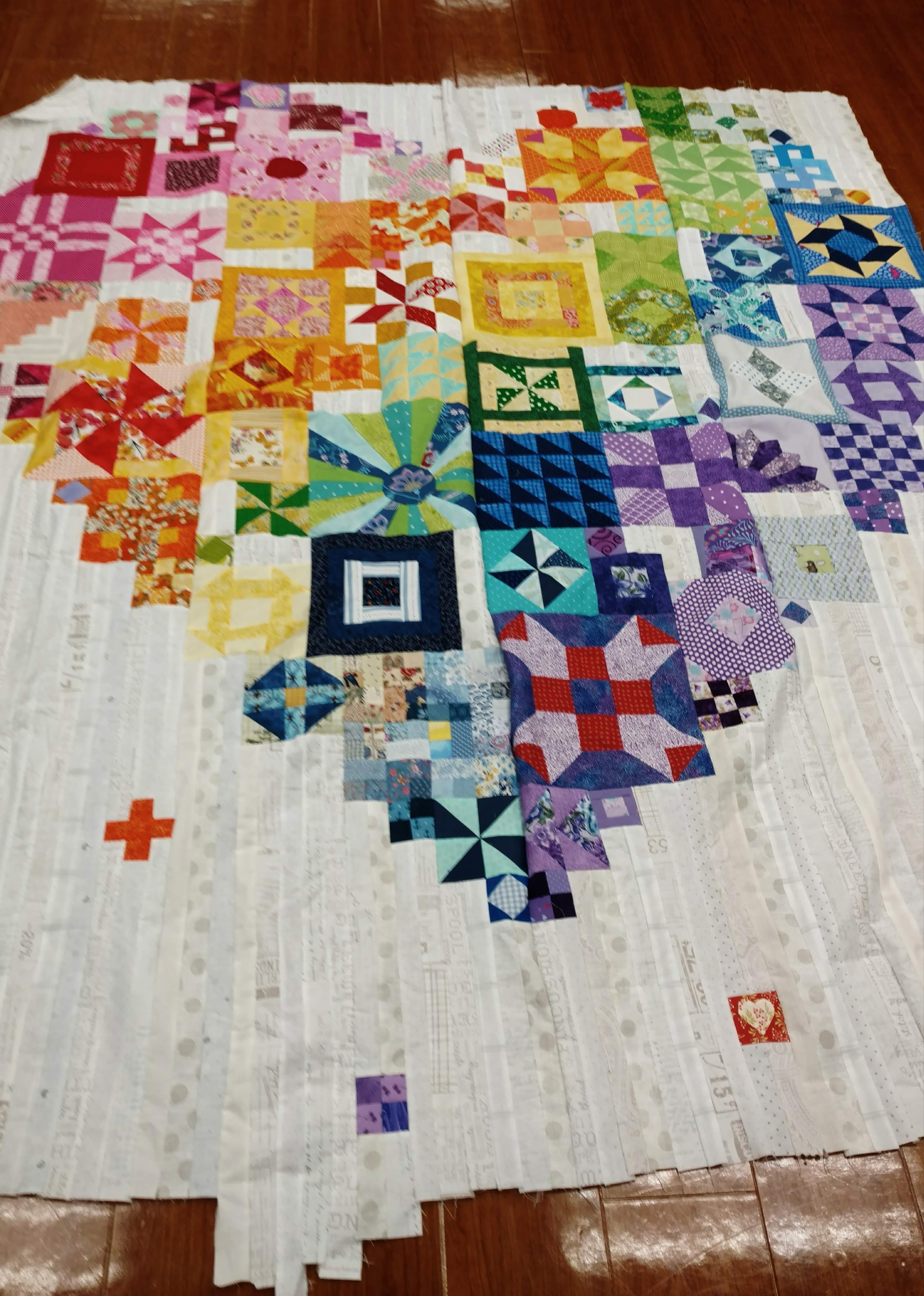 Now my heart is complete, warts and all. What a relief to get to this point. There were 5 of us working on this at the same time. I am the last one to get it to this point. I really didn't plan on doing this with the group. I have so many quilts I want to finish, I didn't want to add this one, and stay current with the rest of the quilters. Plus, I have done a couple of jen kingwell patterns and the instructions are a challenge. They are real headscratchers. I chose to do color sections. Sue made hers with reds and purples for valentines day. Yep, the last one 2022. Linda made hers with wild scraps. Judy made hers with bright blocks and a black background, and Katie is making hers with orphan blocks. They are all very different and very striking.